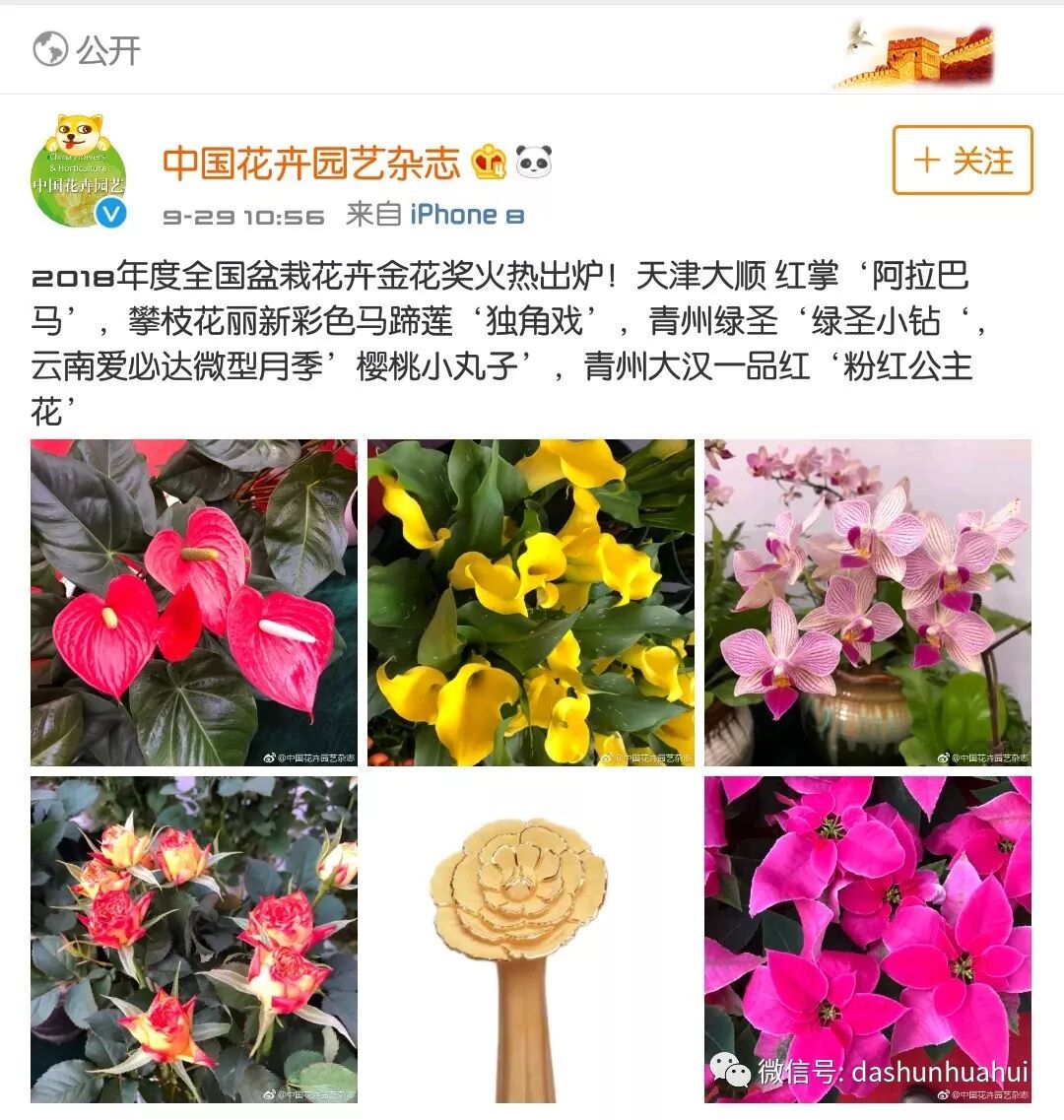 在9月27-29日于山东青州举办的2018年全国花卉博览会上,大顺花卉出产的阿拉巴马红掌荣获全国盆栽花卉最高奖项——“金花奖”! 近些年,随着家庭园艺市场的成长,我国盆栽花卉产业发展迅速,产品质量提升明显,品种日益丰富,周年化供应成为趋势,为了产业健康发展,突出品质品牌导向,中国花卉协会盆栽植物分会在广州创立了盆栽花卉“金花奖”,2018年度的金花奖评选已经是第十届。 历年金花奖的评选向来有花中奥林匹克之称,获奖的花卉也代表着中国盆栽花卉最高水平。评选的标准也大多遵循两个原则,一是必须具有很高的观赏性;二是可以批量生产,可以上千、上万株地培植,具有市场开发的潜力。据悉,今年报奖花卉的同种类产品企业年总产量需达到10万盆以上(含10万盆),报奖单品需达到年总产量1万盆以上(含1万盆)。 大顺花卉出产的花卉品种曾多次获得过金花奖等花卉届的重要奖项,其中宝莲灯花就曾于2007年获得此奖项。此次获奖的红掌阿拉巴马是大顺花卉的明星产品,也代表着大顺花卉出产的花卉一直以来的高品质高颜值。 阿拉巴马红掌原产于哥斯达黎加、哥伦比亚等热带雨林区。绿意丛中一抹红,给人惊鸿一瞥的欣赏性。 红掌按照“叶一花一叶一花”循环生长,花序是在每片叶的腋中形成的。阿拉巴马颜色是纯正的中国红,叶片大深绿色,深受消费者的喜欢。阿拉巴马对温度和光照强度都比较敏感,遇到逆境花的颜色会变黑,叶片边缘发黄,老叶脱落,培养高品质的阿拉巴马非常难,因此栽培时需要对其栽培环境和水肥管理非常严格。 大顺国际花卉股份有限公司拥有30多万平方米的现代化智能温室,配备了气候、灌溉、水处理等先进设备和技术,建立了工厂化生产车间,规范了种苗和成品的生产操作和管理,保障了名贵花卉的质量安全,为构建起科学实用、先进成熟的花卉高效栽培工程化技术体系奠定了基础。因此,大顺花卉出产的阿拉巴马才能傲视群雄,艳压群芳。 目前,宝莲灯花已经在大顺花卉旗下各大电商平台上线,您可以直接下单购买此种金花奖花卉。